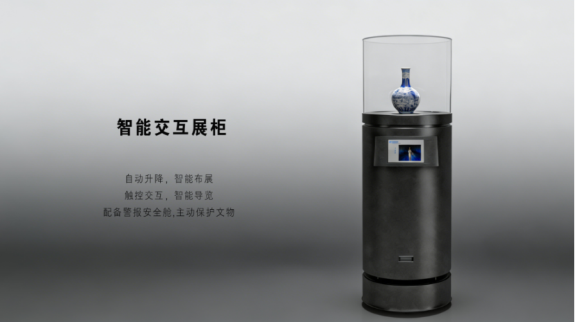 智能升降多功能五斗柜,通过自动升降、指纹锁、五斗柜等设计实现个性化、专属化收藏。智能交互展柜以智能系统为核心,集成智能布展、智能导览、安全预警等模块,配备警报安全舱,构建起“自动展示文物”、“主动保护文物”的智慧展陈系统。